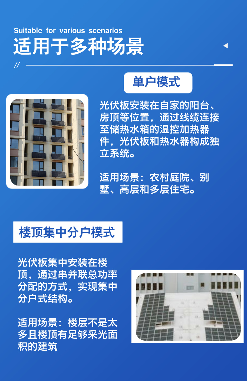 通過光伏板組件將太陽光的光子能量轉(zhuǎn)換成電能。這些電能隨后被用于加熱熱水器中的水。具體來說,當(dāng)光線照射到光伏板(主要由多晶硅等能產(chǎn)生光伏效應(yīng)的半導(dǎo)體材料制成)表面時,光子能量被硅材料吸收,導(dǎo)致電子發(fā)生躍遷,形成自由電子并產(chǎn)生電位差。通過外部接通的電路,電流在電壓的作用下流過電路,產(chǎn)生一定的輸出功率,進而對水進行加熱。