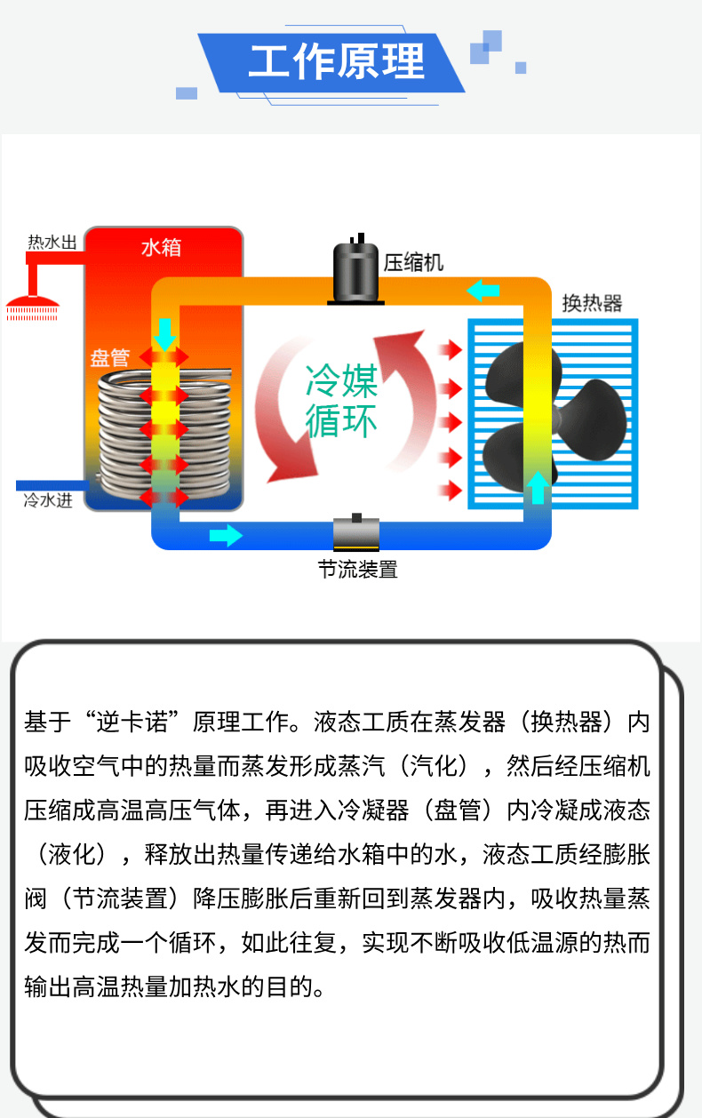 分體式空氣能熱水器主要依據(jù)“逆卡諾”原理工作,通過吸收空氣中的熱量并轉(zhuǎn)化為熱能來加熱水。室外機(jī)(風(fēng)機(jī)盤管)作為蒸發(fā)器,吸收外界空氣中的熱量,經(jīng)過壓縮機(jī)壓縮后,將高溫高壓的制冷劑輸送到室內(nèi)機(jī)(水箱內(nèi)的冷凝盤管),與水進(jìn)行熱交換,從而加熱水箱中的水。